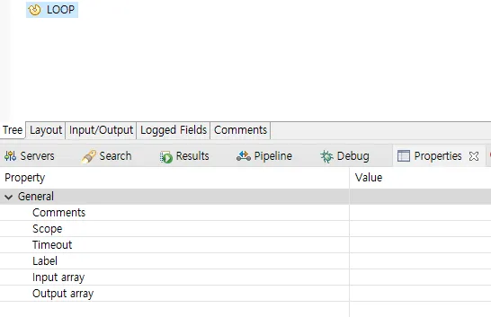 Properties에서 Input array, Output array를 지정할 수 있다. 이 또한 파이프 라인에서 존재하는 리스트명을 적어주면 되는 것이다.