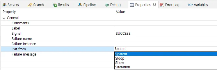 Properties의 Exit on이 SUCCESS/FAILURE로 나뉘게 되는데 SUCCESS일 경우 시퀀스 내의 flow가 실패해도 다음 flow를 실행하고, FAILURE인 경우 시퀀스 내의 flow가 실패하면 시퀀스를 빠져나오게 된다. (breake문이 실패한 경우에 동작한다고 보면 된다.)
