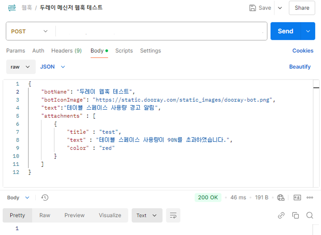 중요한 건 HTTP 요청 보내는 URL에 앞서 설명한 두레이 채팅방 URL을 입력하는 것이다!