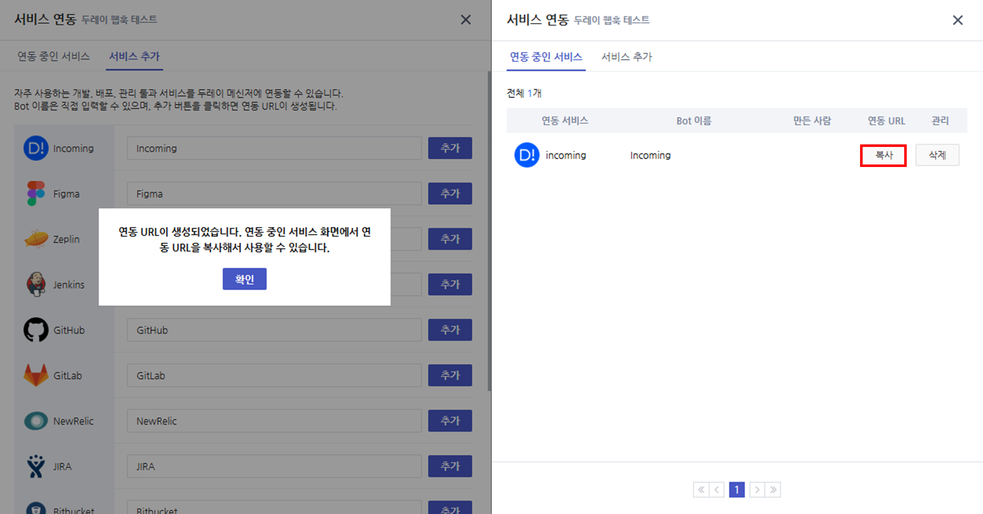 그러면 연동 중인 서비스 탭에서 Incoming 서비스가 추가된 것을 확인할 수 있다.