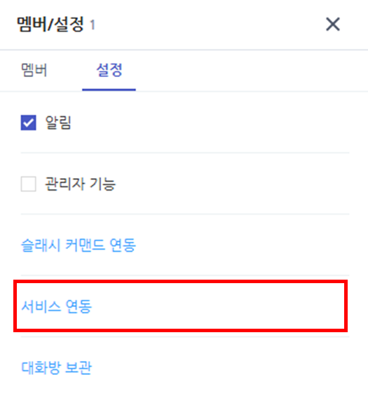그러면 멤버/설정 메뉴가 우측에 나타난다. 그러고 서비스 연동을 클릭한다.