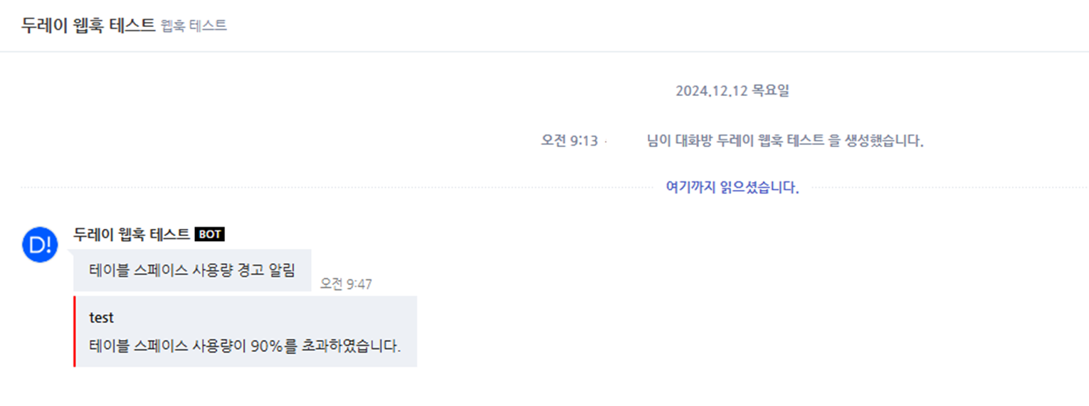 오늘은 Dooray! 메신저를 통해 웹훅을 구현한 방법에 대해 정리해보려고 한다. 데이터베이스의 테이블 스페이스의 사용률, 남은 공간이 특정 기준을 넘었을 경우 메시지가 전송되는 기능을 구현했다.