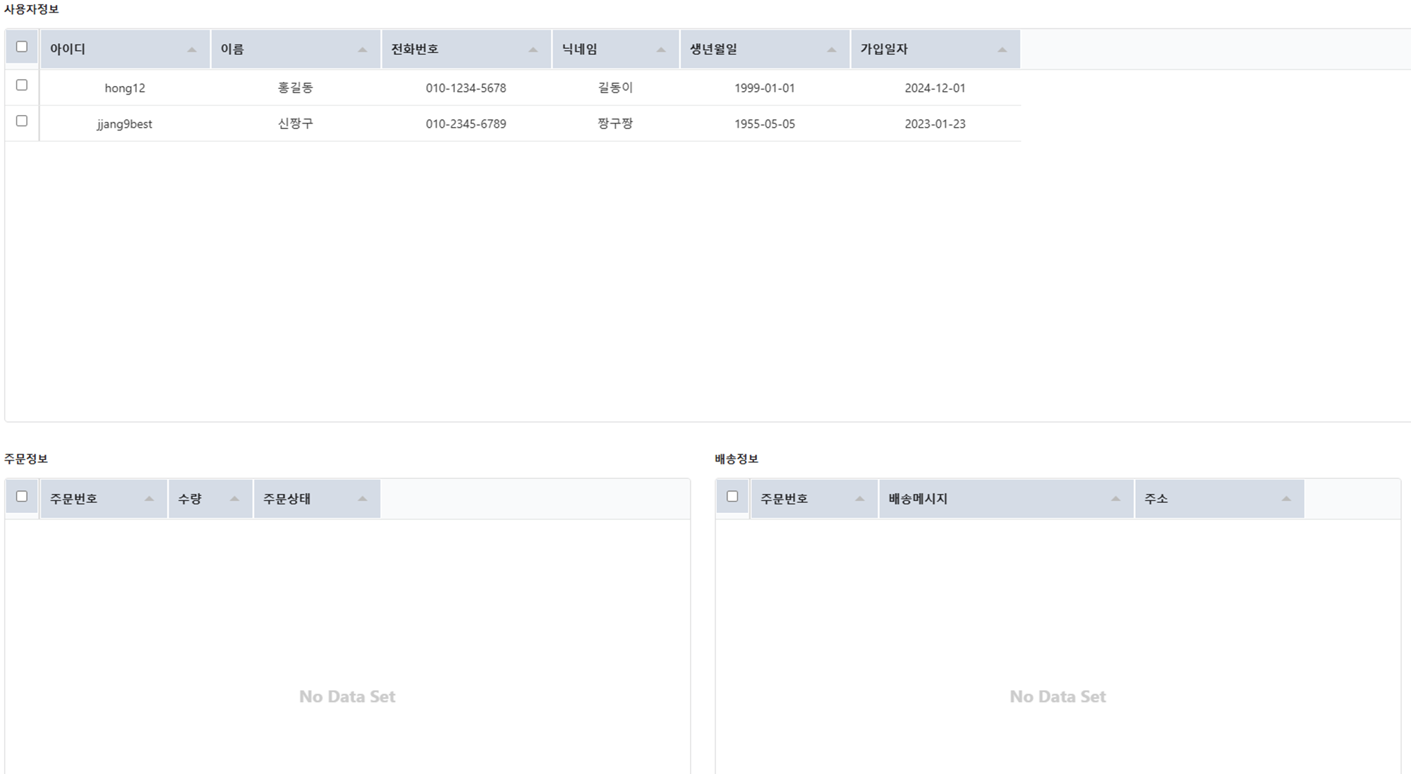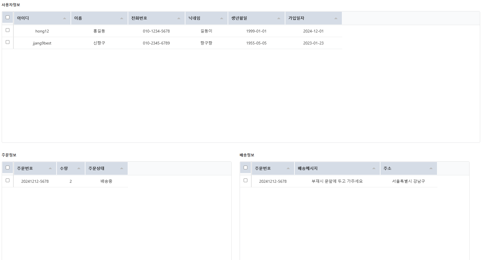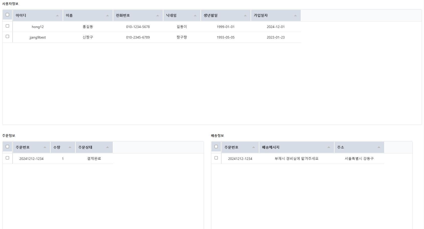상단 테이블에서 사용자 행을 클릭하면 하단의 두 테이블에 주문정보, 배송정보가 보여진다.