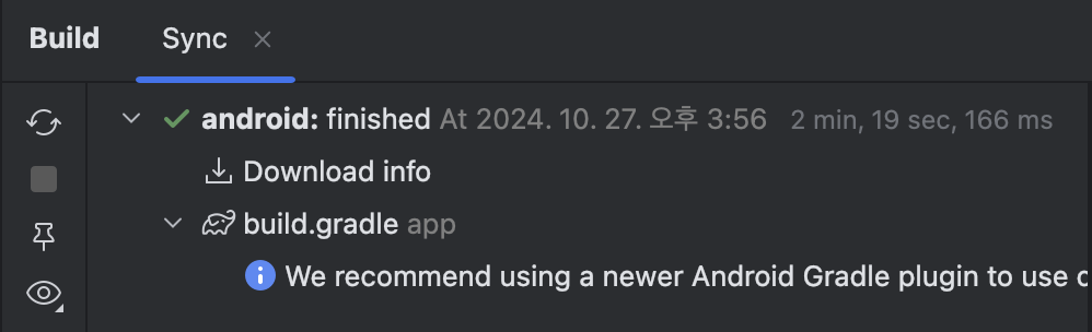 나와 같은 경우 빌드 에러가 발생했다. 에러 메시지를 확인하니까 안드로이드 빌드 툴 버전 34가 설치되어 있지 않다고 한다.