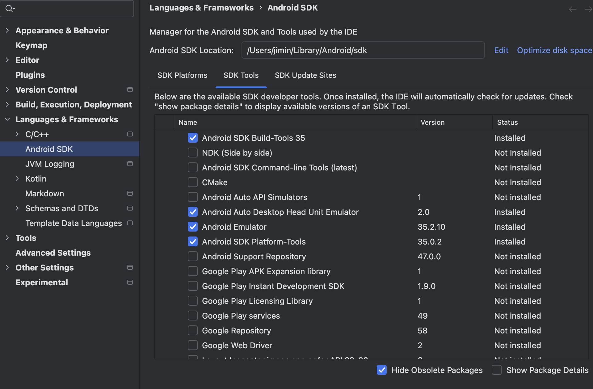 근데 SDK Tools에서 버전이 변경이 안돼서 에러가 해결이 안됐다. SDK Platforms에서 34 버전은 설치 완료한 상태였다.