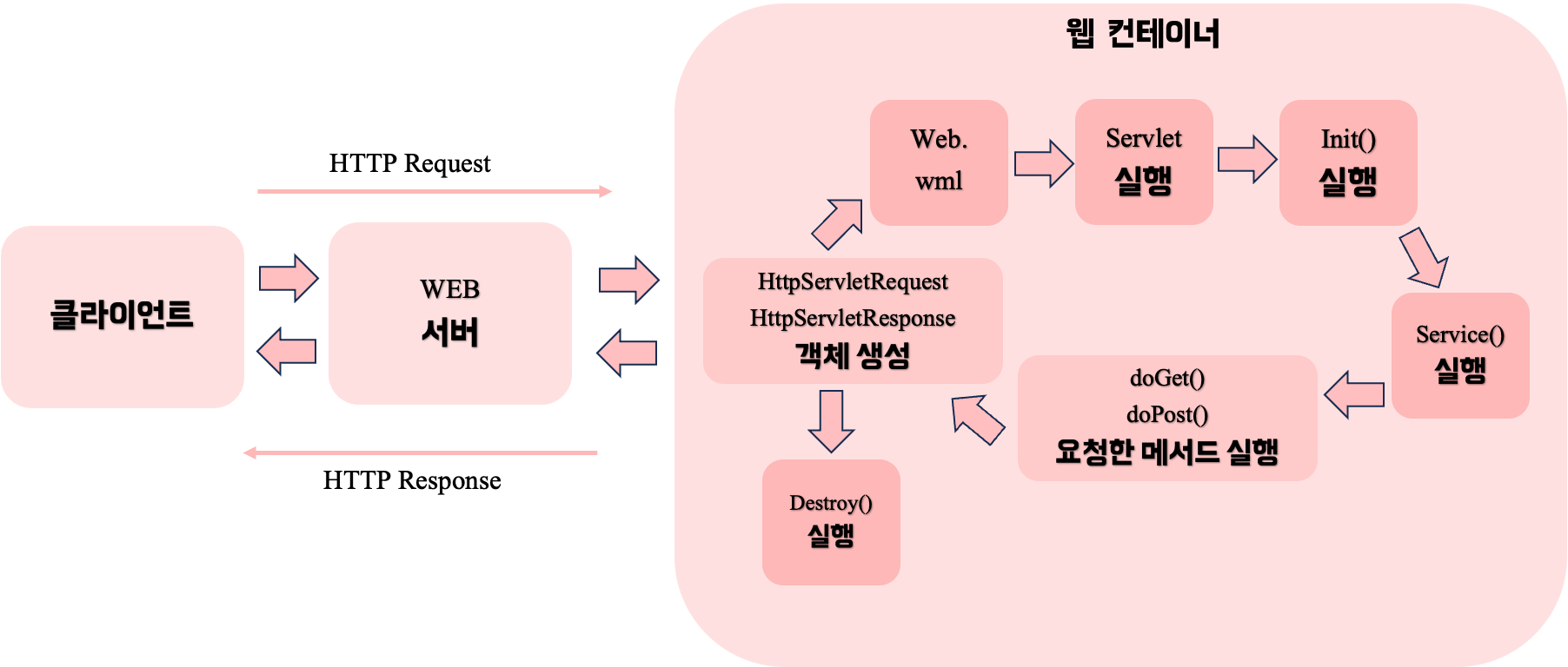 클라이언트에서 요청을 하면 컨테이너는 HttpServletRequest, HttpServletResponse 두 객체를 생성하여 post, get 여부에 따라 동적인 페이지를 생성하여 응답을 보낸다.
